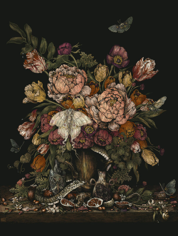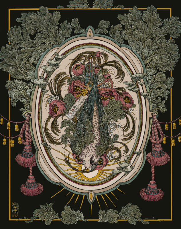 Most known for work blending intricate mark making, surrealism, lore, and occultism. Their work explores emotion and spirit woven through holographic entry points within folklore, sacred symbols, and the natural world.