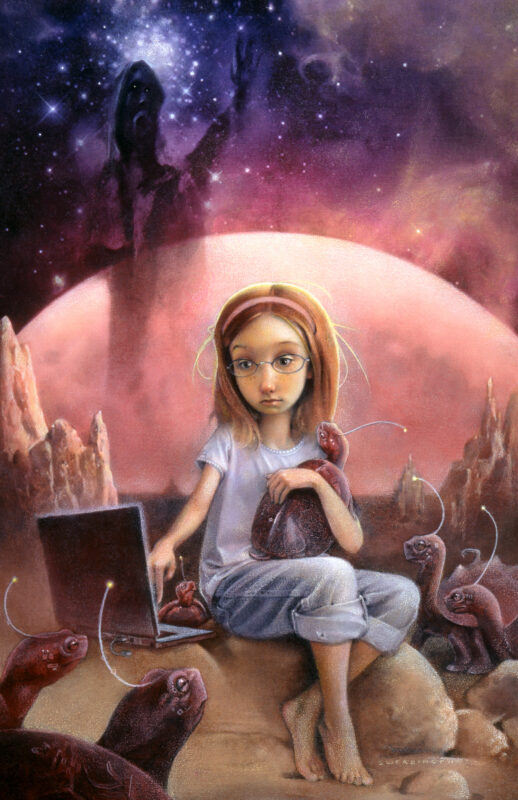 Greg Swearingen has received awards for his illustration from Communication Arts, Society of Illustrators New York, SILA, and Spectrum Contemporary Fantastic Art. He is primarily known for his highly-detailed book covers produced for such authors as Tad Williams, Polly Horvath, Diane Duane and Avi. Greg’s clients include Harper Collins, Scholastic, Penguin Random House, Disney Press, American Greetings and many others. He develops the details and atmosphere in his work with a combination of acrylic, watercolor and colored pencil.