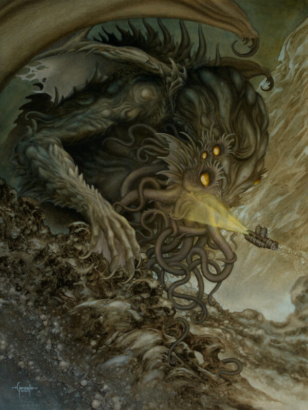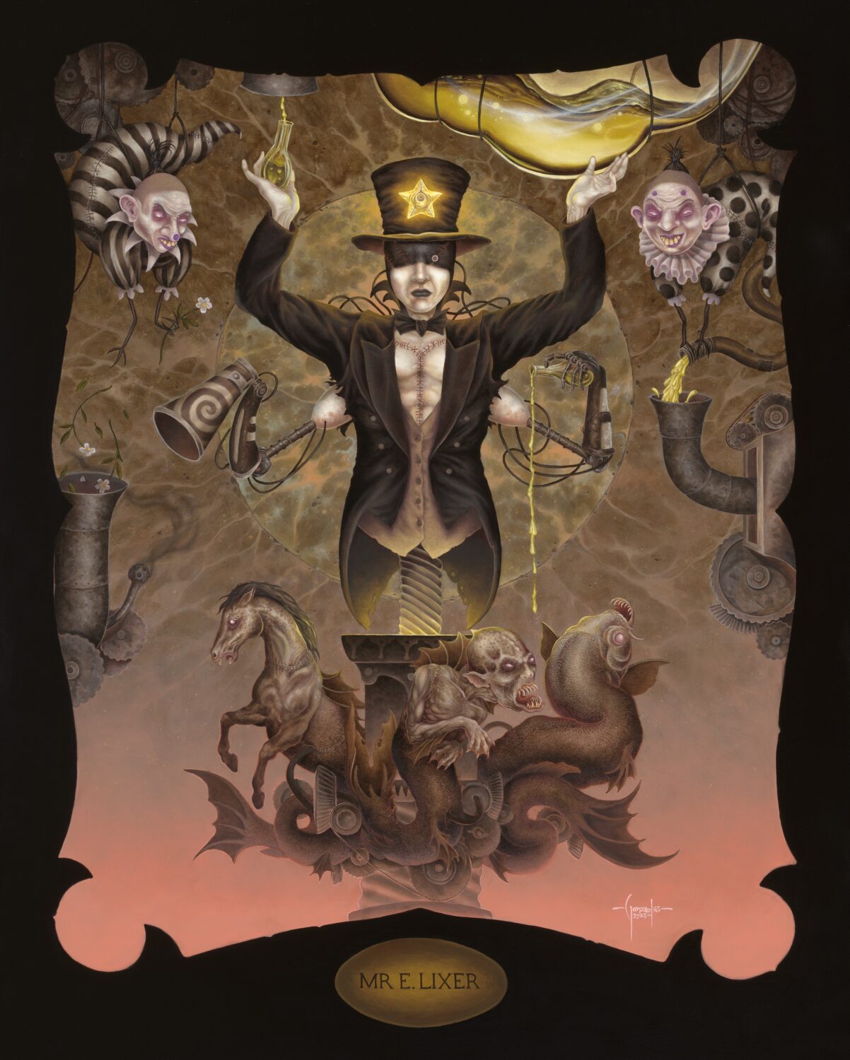 Leo Gonzales was born and raised in Pojoaque near Santa Fe, NM. The films of Harryhausen and the writings of Tolkien had a profound and lasting impact on him from an early age. A love of monsters, and all things fantastic, horrific and alien have always been a driving force in his life. An avid roleplaying and miniature war gamer, he competed professionally for a time in miniature figurine painting and modeling, with a handful of prestigious awards under his belt, including several Golden Daemon awards as well as a Forge World Best in Show. Leo has been tattooing professionally full-time for 31 years. He runs his own tattoo parlor and art gallery – Stay Gold, in Albuquerque, NM and has worked alongside some of the biggest names in the industry. A love and appreciation for mythology and the bio-mechanical tattoo aesthetic, as well as his love of folklore, and the great works of fantasy and horror literature have all culminated in a post apocalyptic vision within his intricately crafted oil paintings. His work has been exhibited in many group and solo shows in Santa Fe and Albuquerque, NM including the POP Gallery and KEEP Contemporary, as well as numerous showings in the Illuxcon Main Show and Evening Showcase. He has several paintings published in Infected By Art Volumes 8, 9, 10 , 11 and 12 as well as the gigantic 2 volume book set- The Bio-mech Encyclopedia (alongside luminaries in the field such as H R Giger, Zdislaw Beksinski, and Guy Aitchison).