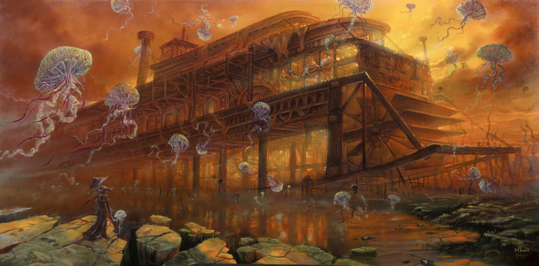 Matt Mrowka is a tattoo artist and a dark fantasy landscape painter currently working in upstate NY. His work derives exclusively from imagination. He uses intense light sources, and a very selective color palette of mostly warm tones in his paintings to help portray heavy narrations. While focusing on structures and landscapes as main subjects, Matt's creatures and characters are often abandoned inhabitants. He keeps the 'meanings' of his illustrations mostly a mystery for others to speculate and create. Inspired by Beksinski, Stephen Gammell, and Lou Marchetti, Matt finds his own environments and brings them to life. Beksinski inspired him to create massive structures that he was comfortable living within. Stephen Gammell taught him that fear itself could be illustrated as a subject. That inspired him to experiment with different and darker moods within a painting. It was Lou Marchetti that inspired him to illustrate the lives of the inhabitants in his dark landscapes, giving the characters a story to tell.