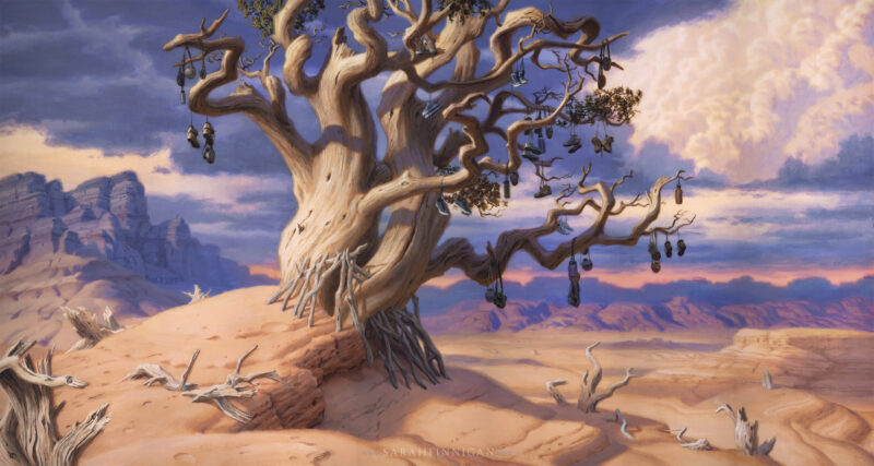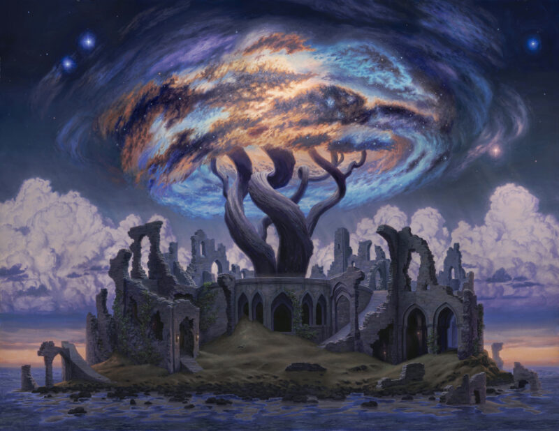 Sarah Finnigan is a Houston-based artist working in acrylics to create portraits of allegorical landscapes. Her inspiration is built on a youth spent getting lost in adventure games, exploring in the woods, and being captivated by astronomy and the night sky. She infuses her work with fantastical elements to spark curiosity and the desire to explore, and to inspire a sense of reverence, awe, and wonder that many experience when looking skyward on a dark, clear night.